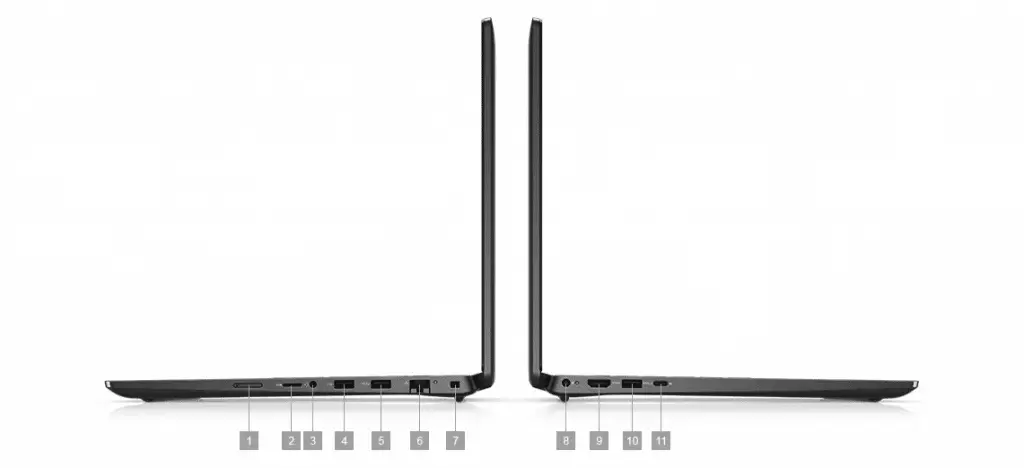 1. Plateau de carte uSIM en option | 2. Logement de lecteur de carte uSD 3.0 | 3. Prise jack audio | 4. Port USB 2.0 | 5. Port USB 3.2 Gen 1 Type-A | 6. RJ-45 avec LED d’état | 7. Logement antivol Wedge | 8. Connecteur d’alimentation 4,5 mm avec LED d’état | 9. Port HDMI 1.4 | 10. Port USB 3.2 Gen 1 Type-A | 11. Port USB-C 3.2 Gen 2 avec DisplayPort mode alternatif/Power Delivery